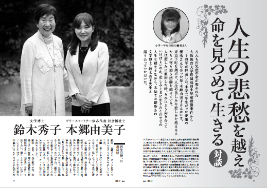 8人もの児童の命が奪われた大阪教育大学附属池田小児童殺傷事件から24年が経過した。小学2年生だった愛娘の優希さんを失った母・本郷由美子さんはいま、東京下町を拠点に、人生の苦しみや悲しみを抱える人たちに寄り添う活動を続けている。人は悲しみに直面した時、それにどう向き合っていけばよいのか。悲しみと共に生きたこれまでの人生を踏まえながら、本誌でお馴染みの文学博士・鈴木秀子先生と語り合っていただいた。