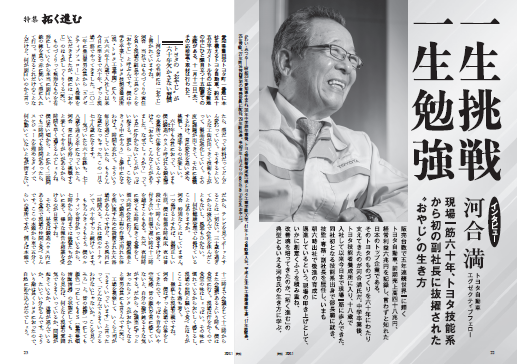 世界に冠たる一流企業のトヨタ自動車で、中卒の技能系出身から初めて副社長に抜擢された河合満さん、77歳。現在はエグゼクティブフェローという立場ながら、社内で〝おやじ〟と呼ばれ、皆に慕われています。11月13日、愛知県豊田市にある本社にて取材は行われました。「僕の人生は一生挑戦だし一生勉強」。2時間にわたり仕事の流儀を語られる河合さんの輝きに満ちた瞳が印象的でした。
