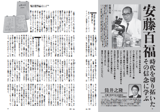 安藤さんは〝世界の食を変えた男〟との異名を取る日本を代表する経営者のお一人ですが、決して威張らず、ユーモアに富み、一記者である私とも懇意にしてくださいました。約3年間にわたって安藤さんと共に全国各地を渡り歩くうちに、その人柄に惹かれていったのです。