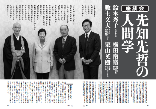 碩学・安岡正篤師のこの言葉は、私たちが先達に学ぶ所以を端的に示している。『致知』も48年、古典と歴史と人物を三本柱に据え、毎号の編集に努めてきた。本誌連載の執筆陣である鈴木秀子氏、數土文夫氏、横田南嶺氏に、『致知』の愛読者で無類の読書家として知られる栗山英樹氏を加えた四氏による座談会。それぞれの人生に彩りを添えてきた先知先哲の教えや言葉を語り合うことで見えてくる人間学の深奥な世界とは――。
