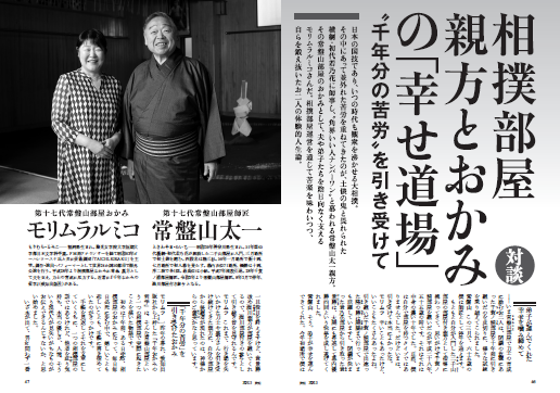 日本の国技であり、いつの時代も観衆を沸かせる大相撲。その中にあって並外れた苦労を重ねてきたのが、土俵の鬼と畏れられた横綱・初代若乃花に師事し、〝角界いい人ナンバーワン〟と慕われる常盤山太一親方。その常盤山部屋のおかみとして、夫や弟子たちを陰日向なく支えるモリムラルミコさんだ。相撲部屋運営を通じて苦楽を味わいつつ、自らを鍛え抜いたお二人の体験的人生論。