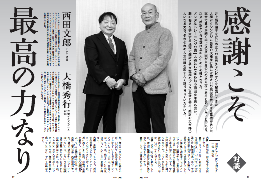 メンタルトレーニングを通して数々のアスリートやチームを勝利へと導いてきたサンリ会長の西田文郎さん、井上尚弥選手ら5人の世界王者を輩出してきた大橋ボクシングジム会長の大橋秀行さん。興味深いのは、お互いがそれぞれの歩みの中で感謝の心の大切さに辿り着き、感謝の力で仕事や人生の壁を乗り越えてこられたことです。実践に裏打ちされたお二人の体験談は説得力に満ちています。