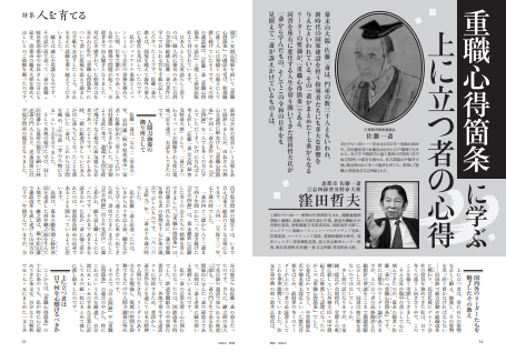 小泉氏ばかりでなく、中曽根康弘氏や橋本龍太郎氏といった歴代首相をはじめ、政財界の多くのリーダーが上に立つ者の必読書としてこれを拳拳服膺していました。住友生命中興の祖・新井正明氏は、碩学・安岡正篤師を招いて『重職心得箇条』の講話を受け、幹部職に就く人には和綴じの冊子にして渡し続けていたそうです。その時の講話録は、『佐藤一斎「重職心得箇条」を読む』と題して致知出版社より刊行されています。……(続きは本誌にて)