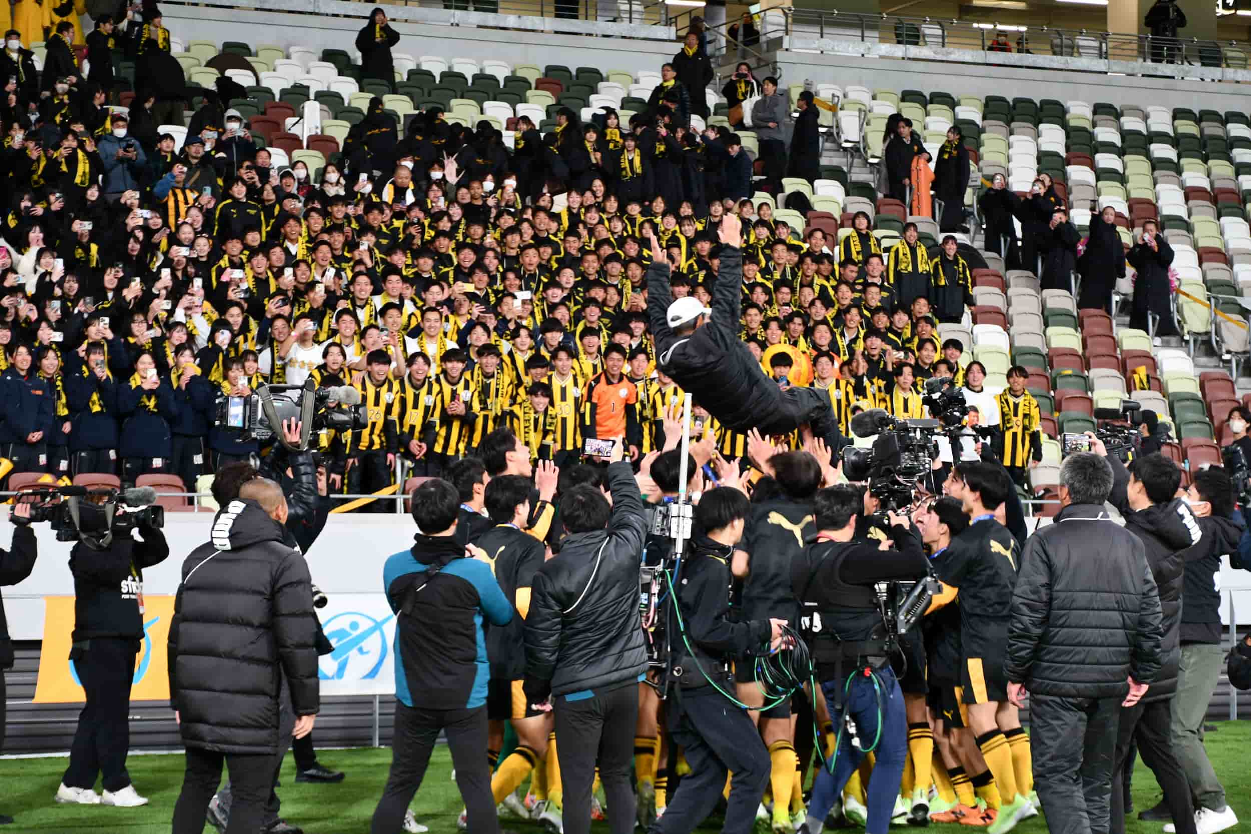【写真=7大会ぶりに決勝の舞台に戻ってきた2024年度全国高校サッカー選手権。流通経済大柏とのPK戦10人目までもつれ込む死闘を制し、2度目の高校選手権制覇を果たした】