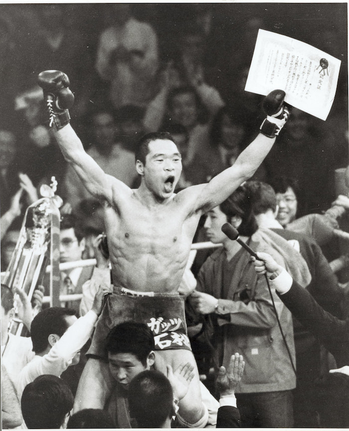 【写真=1974年4月11日、アジア初の世界ライト級チャンピオンに輝き、両手を挙げてガッツポーズをするガッツ石松氏】