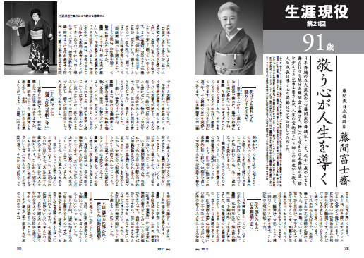 藤間流の日本舞踊家として90歳を越えるいまなお舞台に上がり続けている藤間富士齋さん。取材会場に着物姿でお越しになった藤間さんの凛とした佇まい、そして立ち姿から、藤間さんが重ねてきた修養が伝わってくるようでした。なぜいまなお現役を貫くことができるのか、何歳になっても充実した人生を実現する要諦が満載のインタビューです。