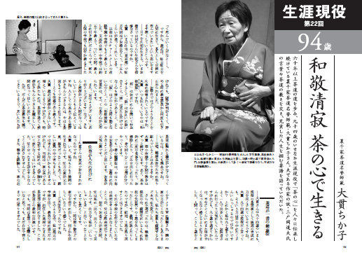 60年以上茶道の道を歩み、94歳のいまなお生涯現役で「茶の心」を人々に伝承し続けている裏千家茶道名誉師範・大貫ちか子さん。夫である作家の故・三戸岡道夫氏の言葉や茶道の教えを交え、充実した人生を掴む要諦を語っていただいた。