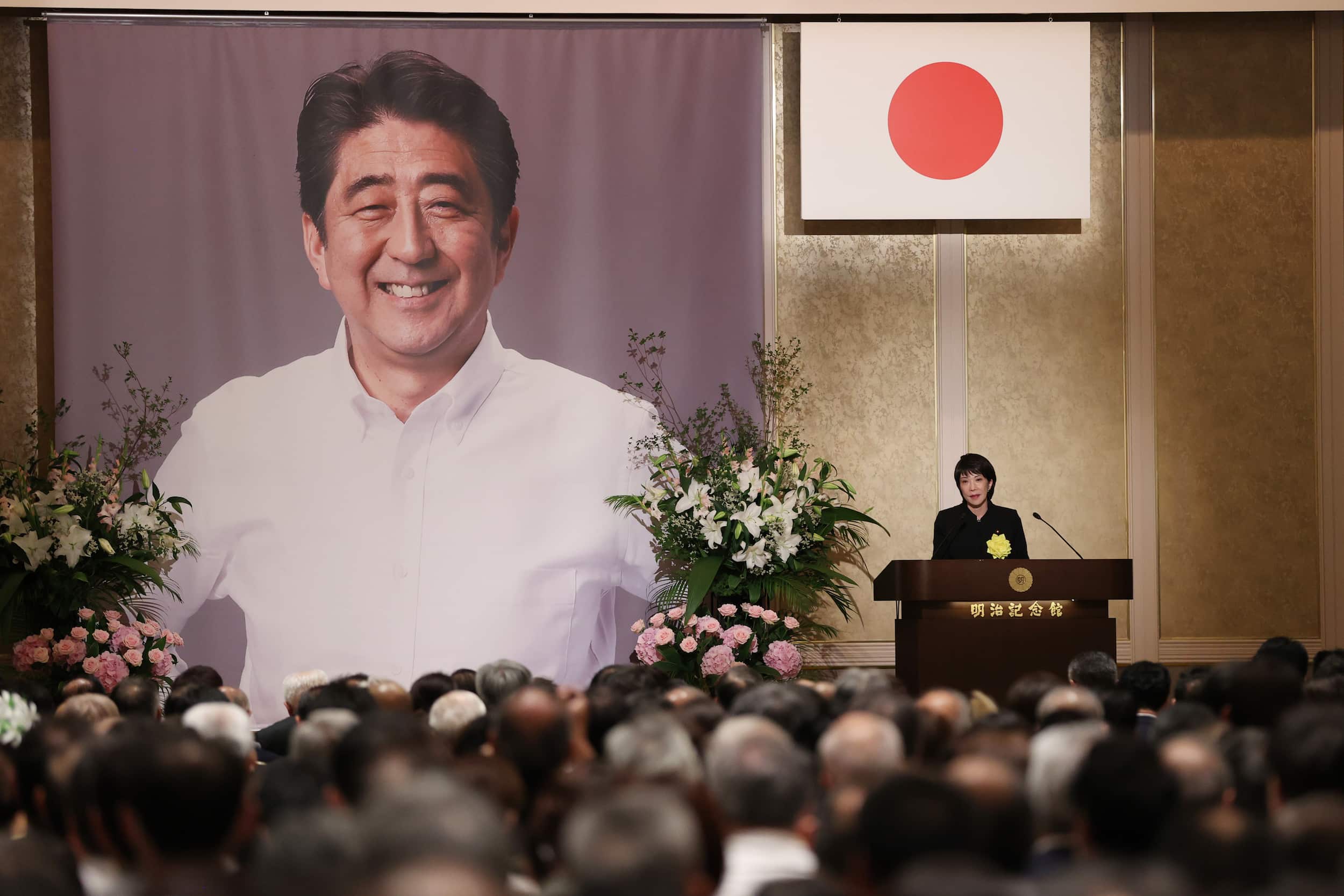 【写真=凶弾に倒れた故・安倍晋三元首相の追悼集会で壇上に立つ高市氏(2023年、当時経済安全保障担当相)©時事】