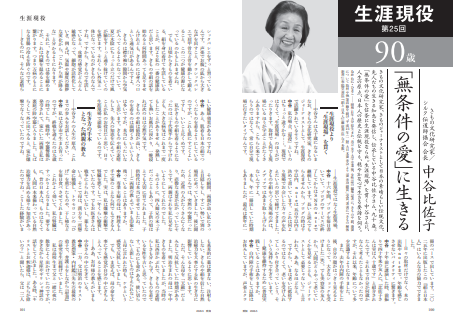 きもの文化研究家、きものジャーナリストとして日本の素晴らしい伝統文化、先人たちの生きる知恵を発信し、伝承している中谷比佐子さん、90歳。「無条件の愛」を信条に生涯現役ならぬ〝生涯現場〟を貫く中谷さんに、人生の原点、日本人の歴史と伝統を守り、穏やかな心で生きる要諦を伺う。