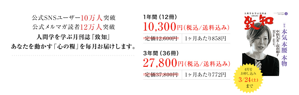 『致知』と出会ってもう10年以上になる。人は時代の波に振り回されやすいものだが、『致知』は一貫して「人間とはかくあるべきだ」ということを説き諭してくれる。人生において、そうしたぶれない基軸を持つということがいかに大事であるか、私のような年代になると特に強くそう感じる。最近では若い人の間にも『致知』が広まっていると聞く。