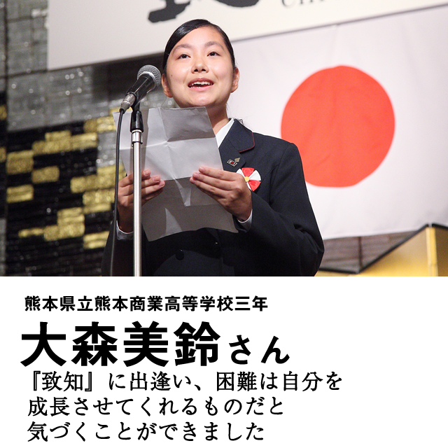 続いて弊社社長の藤尾は、「致知の一道―――四十年を歩みきて」と題して話しました。昭和五十三年に『致知』を創刊して今年で四十年。その折節で得た言葉や学びの数々を、創刊時の二つの原点、そして『致知』が今日に至る上で転機となった三つの出来事に沿って話を進めました。 また、講演の途中には四名の『致知』愛読者が登壇し、「致知と私」と題して「愛読者スピーチ」が行われました。中学一年生の鈴木耀水さんを筆頭に、高校三年生の大森美鈴さん、小学校教諭の山﨑敏哉さん、そして会社役員の梅守志歩さんには、『致知』との出逢いを通じて、いかにして人生をひらいてこられたのかを語っていただきました。会場からは若い愛読者に向けて、惜しみない拍手が送られました。 『致知』を代表的国民雑誌にという故渡部昇一先生の言葉を胸にさらなる前進を誓うとともに、講演の締括りには弊社の若手社員七名が安岡正篤先生の「萬燈行」を壇上で披露う。その渾身の唱和は会場全体にこだまし、参加者一人ひとりの心にまで響き渡りました。