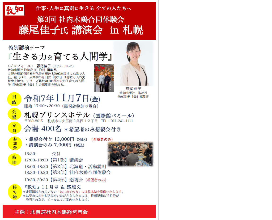 【募集中】 11/7(金) 致知別冊「母」編集長 ・ 藤尾佳子が北海道で講演します!