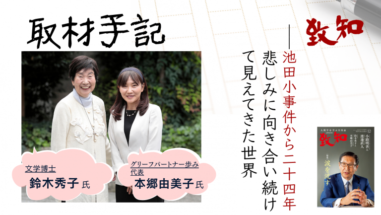 2001年に起きた大阪教育大学附属池田小児童殺傷事件から24年の歳月が流れました。12月号で「涙を流す」という特集を組むに当たり、池田小事件で当時小学2年生だった愛娘の優希さんを亡くした本郷由美子さんにご登場いただきたいと考えました。その思いを本郷さんにお伝えしたところ、「これは私の夢でもあるのですが…」として、本誌でお馴染みの文学博士でシスターでもある鈴木秀子先生との対談を希望されました。