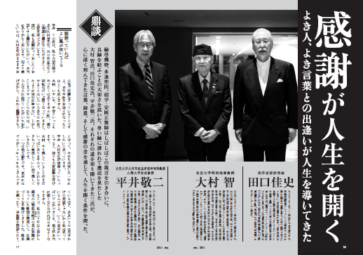 『致知』の取材を通じて実感するのは、一流の人はいくつになっても謙虚に学び続けていること。大村さんは言うまでもなく、共に鼎談にご登場いただいた田口佳史さん、平井敬二さんも、それぞれに東洋思想、製薬の分野で卓越した実績を挙げ、いまも学び続けておられる一流人です。
